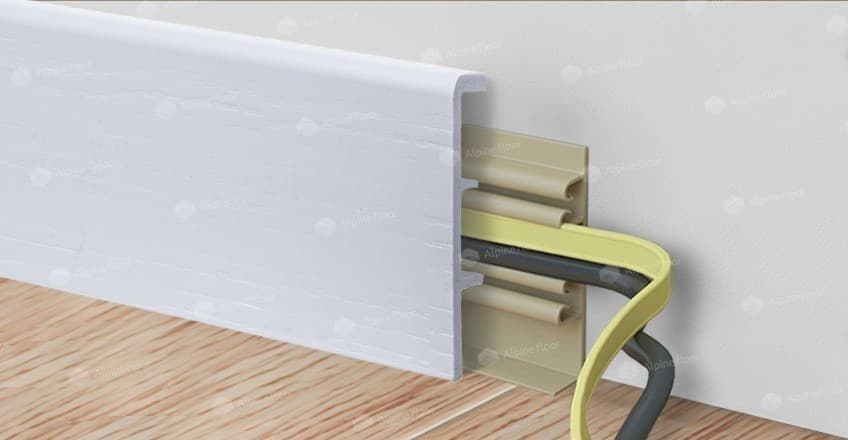 Монтаж происходит на монтажные клипсы. При монтаже плинтус запиливают под углом под 45 градусов, что позволяет сделать стыковку плинтуса практически незаметной.